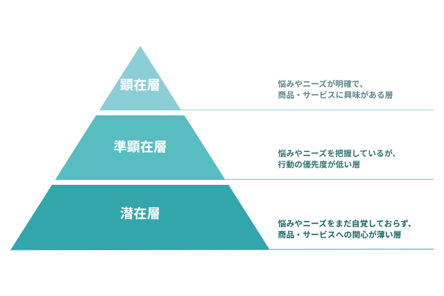 - 顕在層は自分の悩みやニーズを明確に把握しており、すでに解決策を模索している
